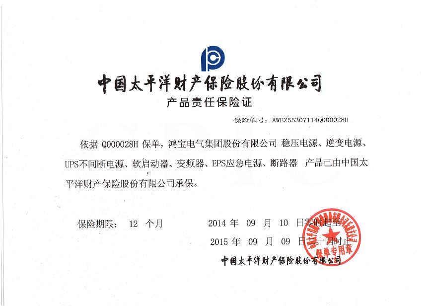 本報(bào)訊:依據(jù)Q000028H 保單,鴻寶電氣集團(tuán)股份有限公司 穩(wěn)壓電源、逆變電源、UPS不間斷電源、軟啟動(dòng)器、變頻器、EPS應(yīng)急電源、斷路器 產(chǎn)品已由中國太平洋財(cái)產(chǎn)保險(xiǎn)股份有限公司承保。